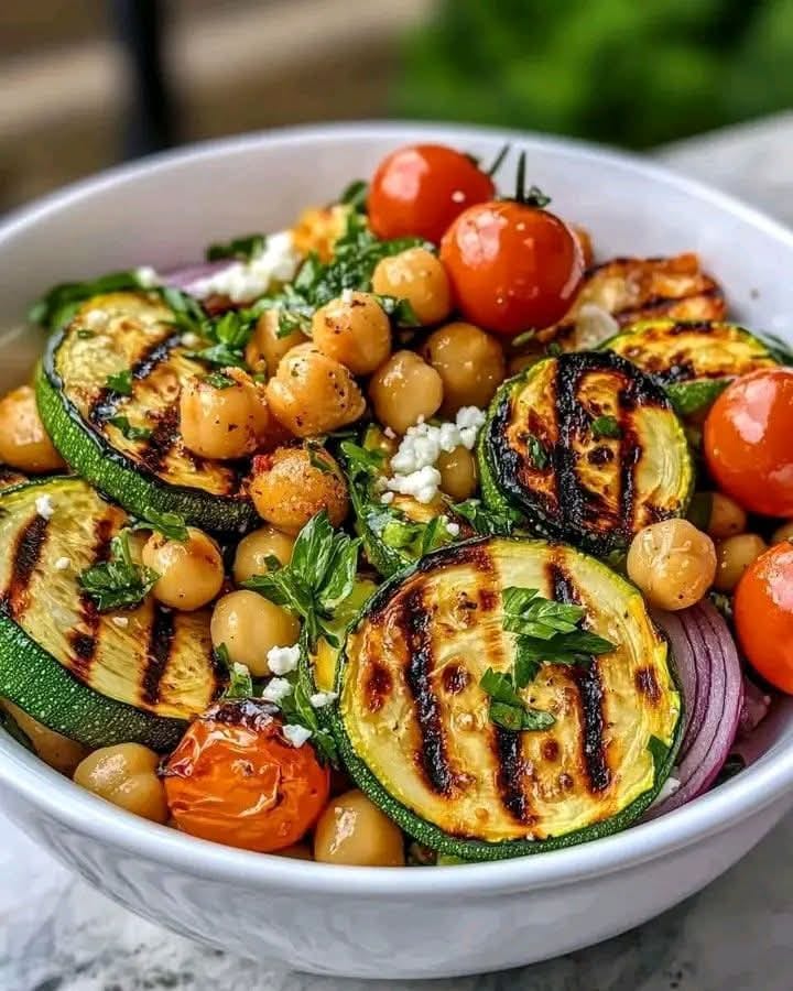 There’s something undeniably special about a dish that comes together simply, tastes fresh, and makes your entire kitchen smell like summer. That’s exactly what happens every time I make this **Grilled Zucchini & Chickpea Salad**—it fills the house with a warm, smoky aroma that instantly makes everyone ask, *”What are you making?”*