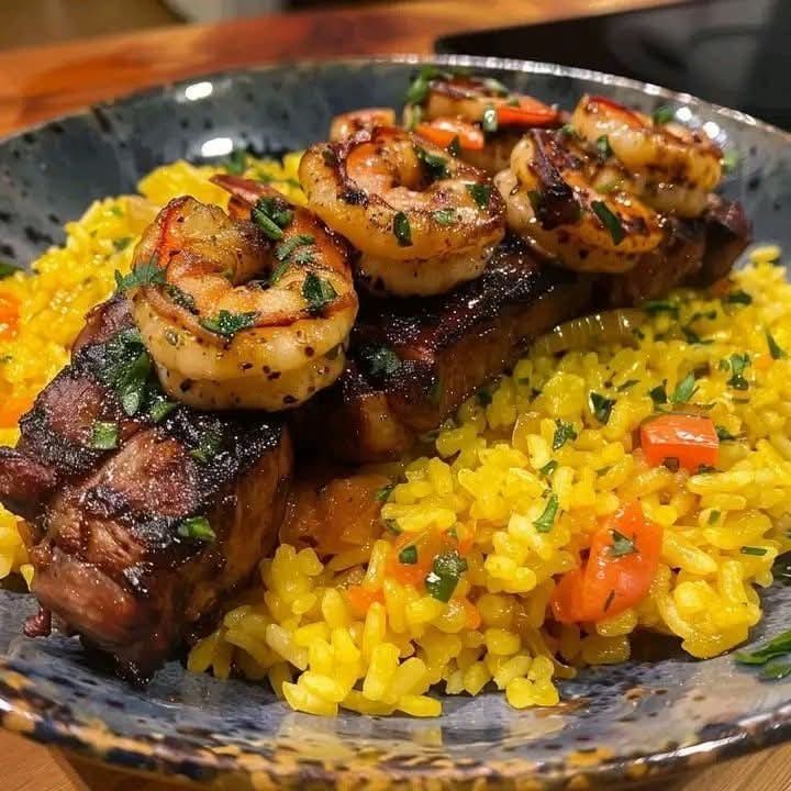 This recipe combines tender slices of juicy steak and succulent shrimp, both marinated in a spicy jerk blend that’s smoky, savory, and just the right amount of spicy. Served over a bed of golden yellow rice infused with aromatic spices like turmeric, garlic, and onion, this dish is a full sensory experience — colorful, fragrant, and absolutely unforgettable.