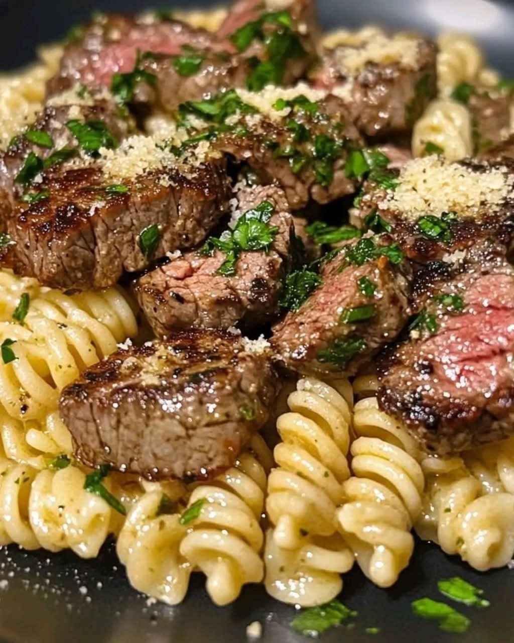 ### Steak Bites and Rotini in Garlic Parmesan Sauce: A Perfect Blend of Savory and Creamy